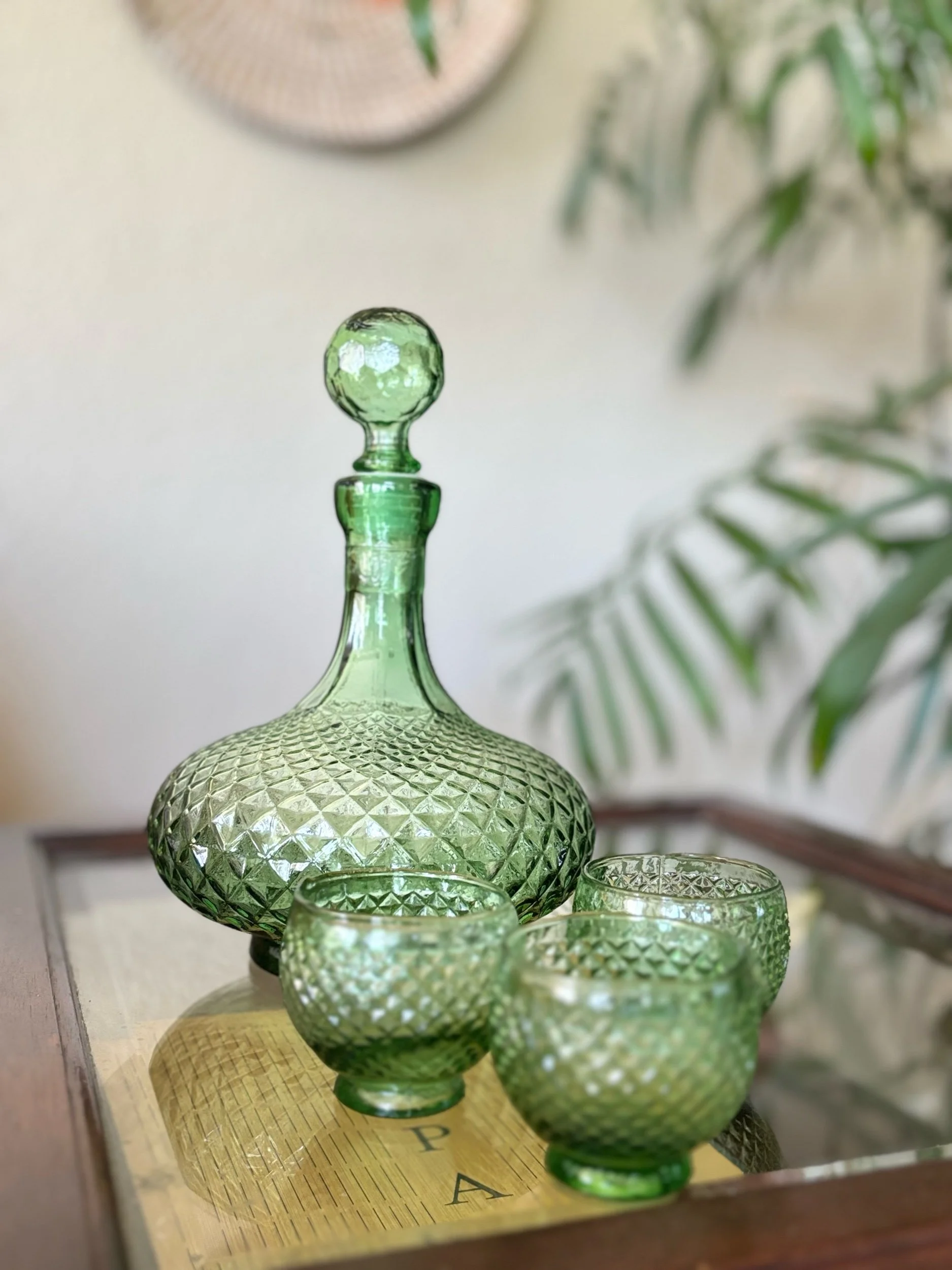 Vintage green glass decanter and shot glasses from the 1920s: $60
